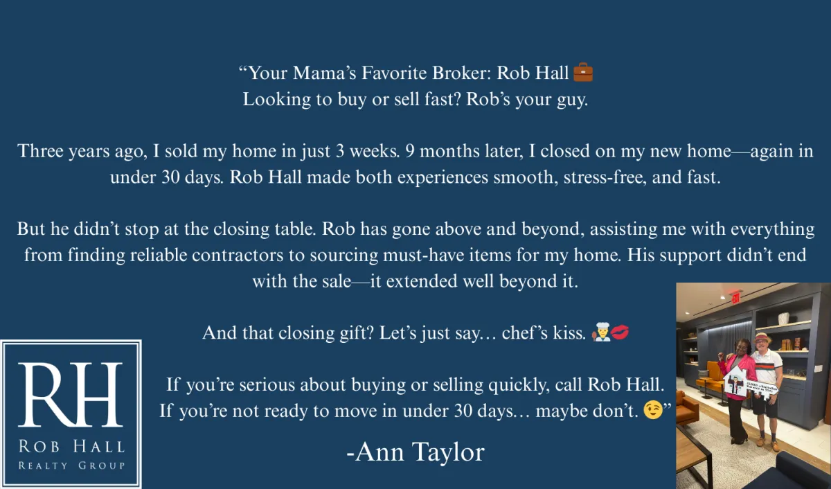 With over $100M in closed volume and 300+ families served, I’m more than a top-producing agent; I’m your data-driven real estate strategist. Since launching Rob Hall Realty Group in 2012, I’ve ranked in the top 5% of agents, using real-time market trends, pricing analytics, and elite credentials (Associate Broker, CLHMS, CNE) to protect your equity and build generational wealth. My client-first approach, sharp negotiation, and luxury market expertise make every transaction feel strategic, seamless, and stress-free.